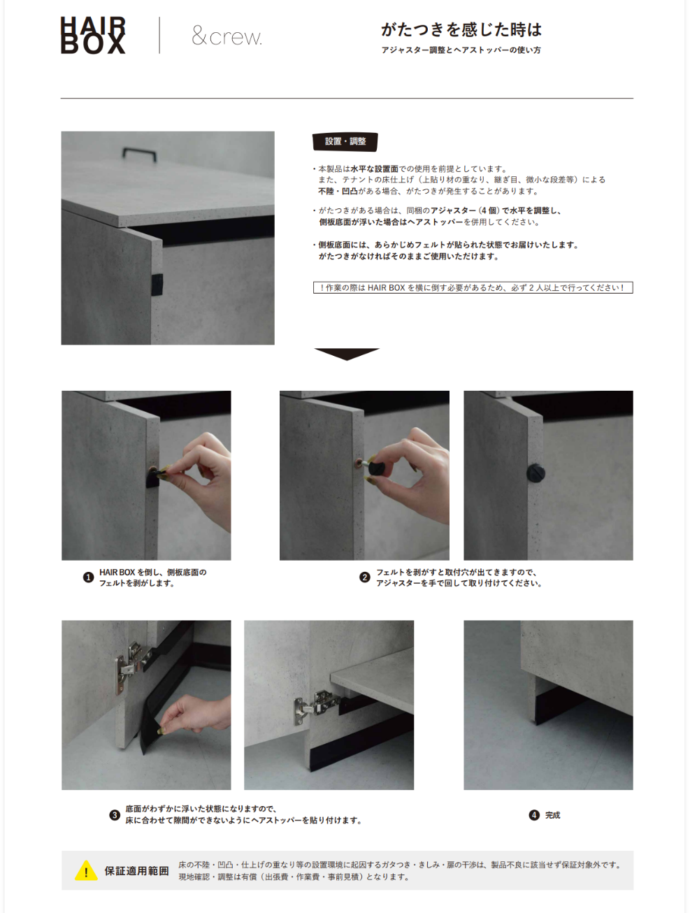 ・床の不陸・凹凸・仕上げの重なり等の設置環境に起因するガタつき・きしみ・扉の干渉は、製品不良に該当せず保証対象外です。